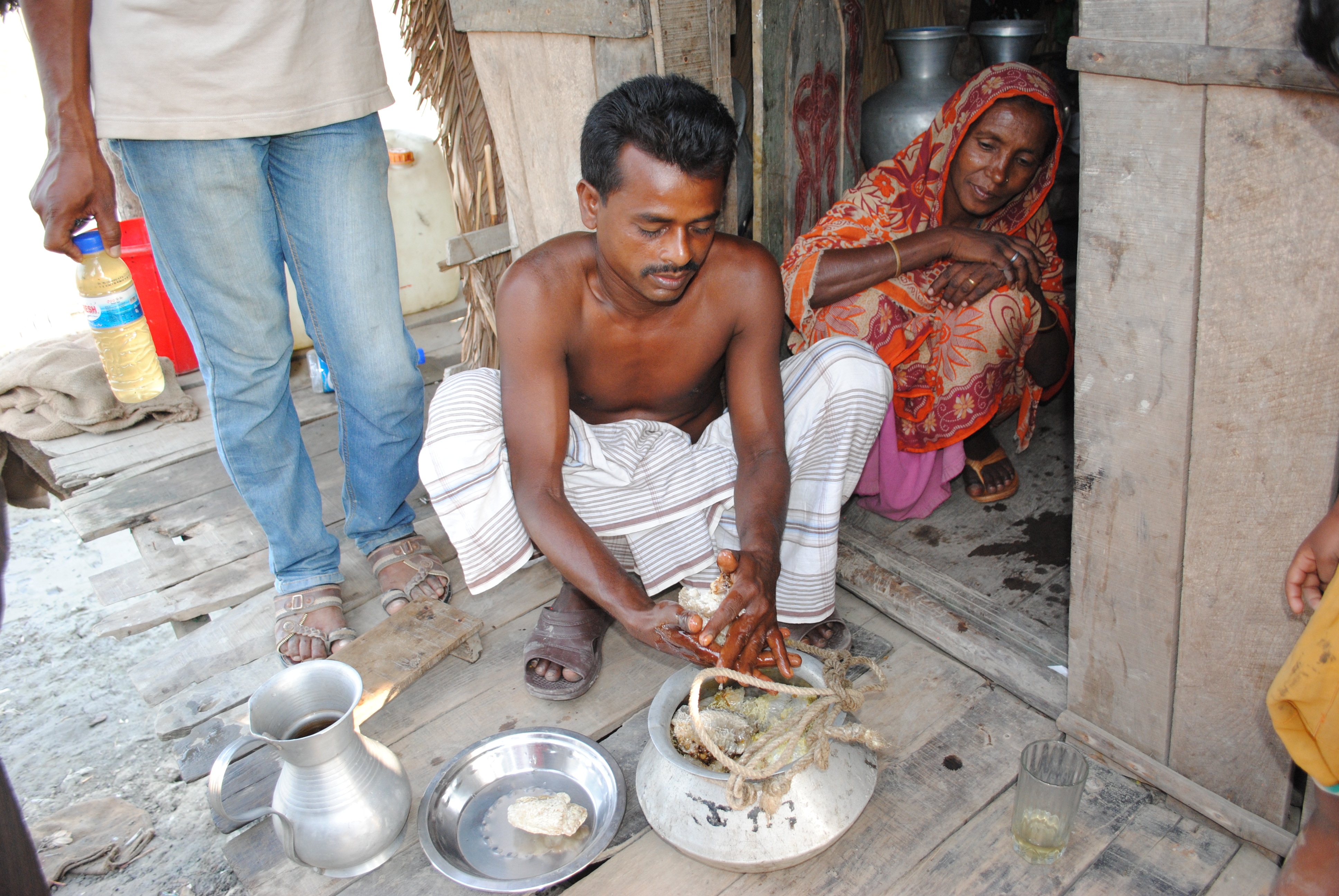 Wearing just a long-sleeved shirt and a scarf over his face, he climbed a six-meter-high tree to cut hunks of honeycomb and smoked bees from their hive. His wife “prays to almighty Allah,’’ said Mr. Gazi, for his safety. He emerged five hours later and returned to his thatch hut in Koyra, where he squeezed the honeycomb like big sponges over a battered metal pot. The two kilograms he harvested fetched 700 taka, about $9, enough to feed his family.