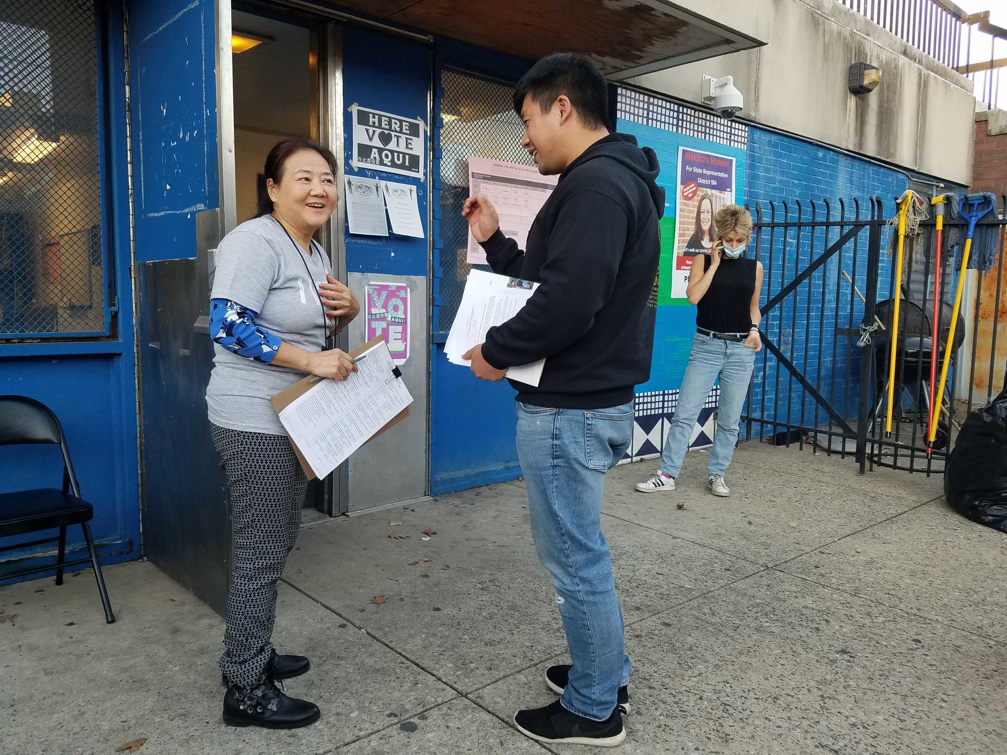 Christie Yang, who normally works as a psychoanalyst, served as an interpreter at the voting site. By mid-afternoon, Yang had assisted eight people, including two Chinese American women whom she walked to their correct polling site 15 minutes away. She also helped an Asian American couple in their 90s vote for the first time. She recalled they were nervous, had poor vision and ran into trouble when a poll worker didn’t set up the voting machine correctly for them. But that didn’t stop them from casting their ballots.